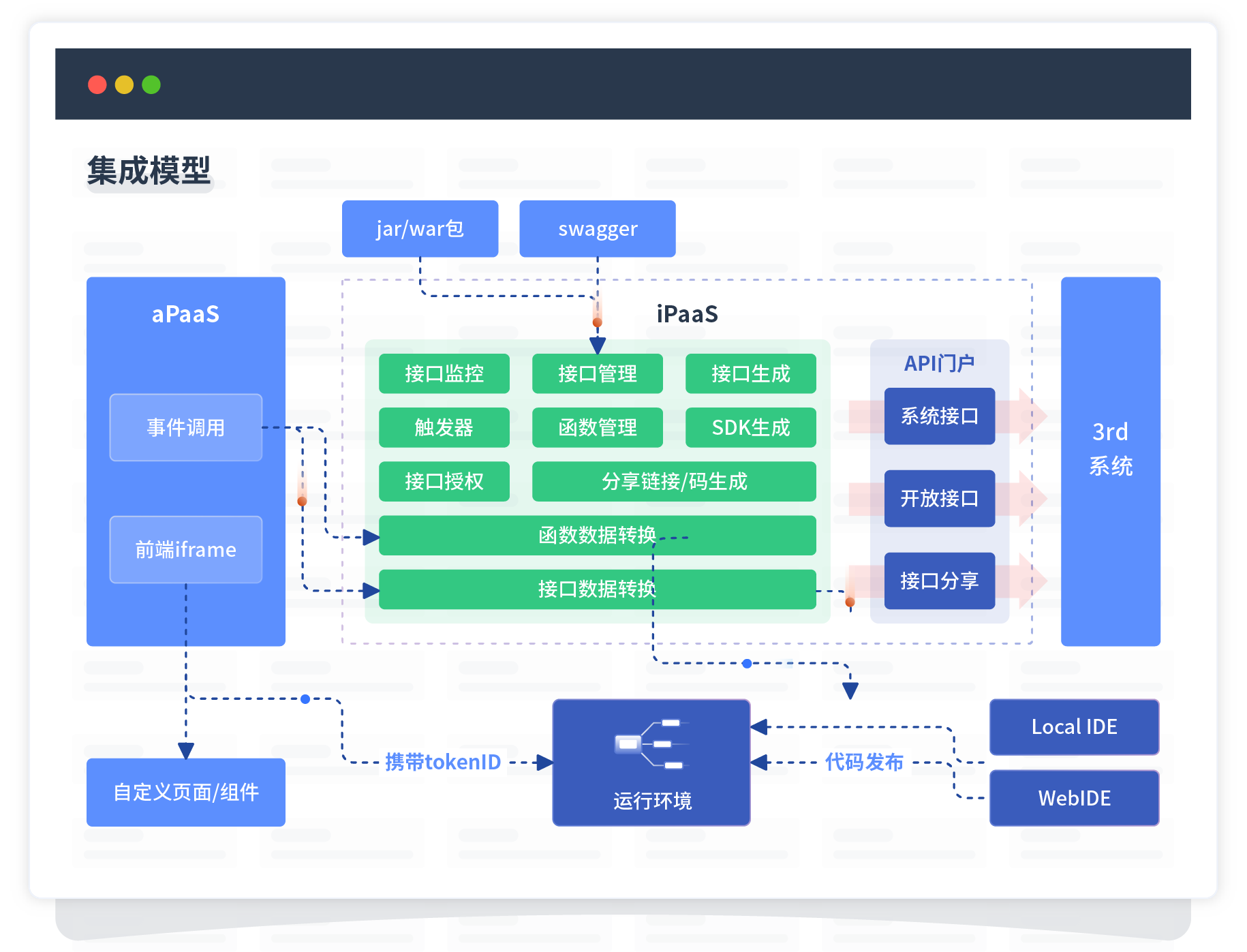 集成模型包括平台本身前、、、、、、、、、、后端能力的扩展,,,,,,也支持通过API门户和第三方系统进行交互。。。。。。。。