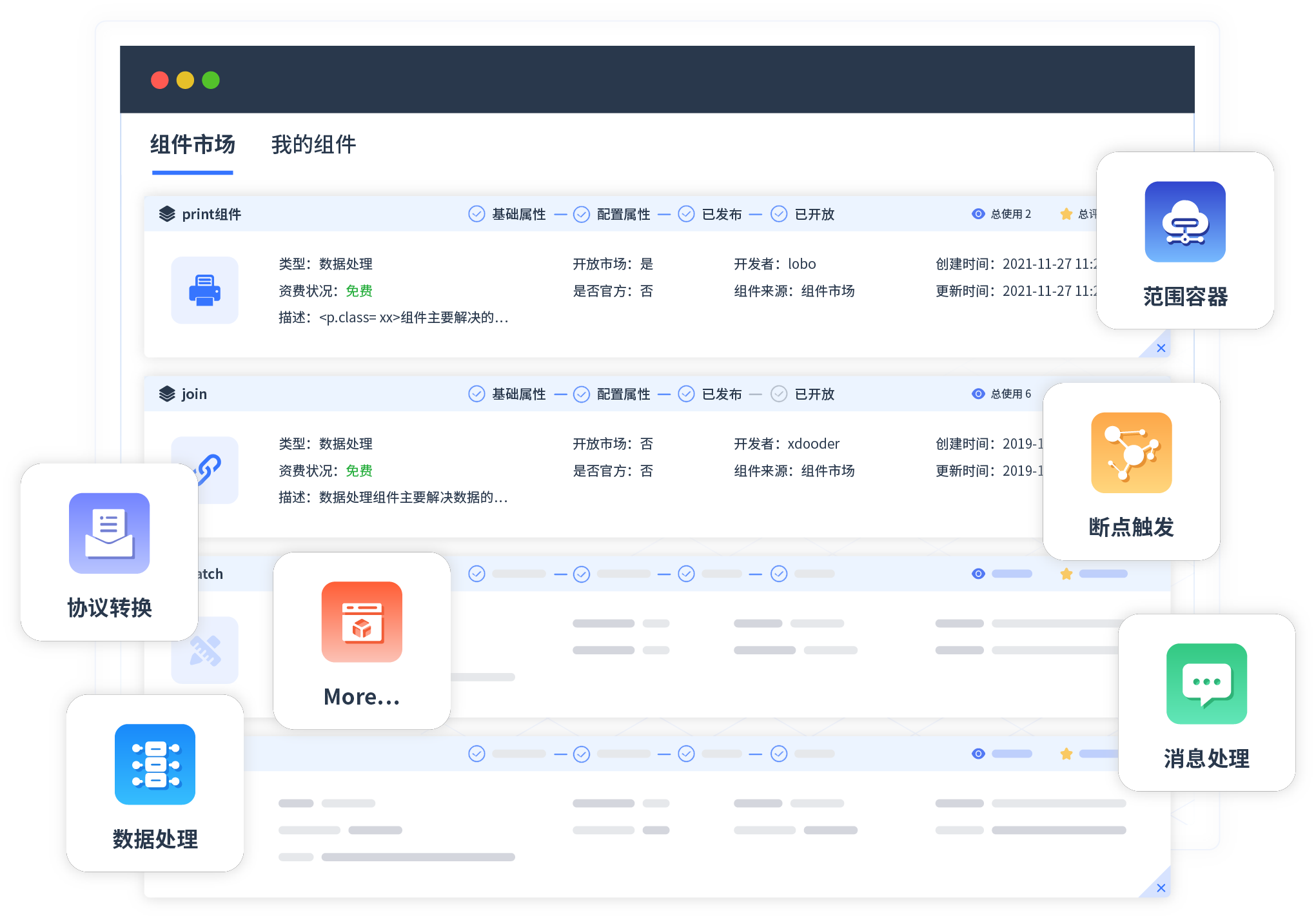 针对集成场景,,,,,,,OPPO钱包提供组件市场,,,,,,,,,,,,,例如协议转换、、、、消息处理、、、、、、、、文件操作等。。。。。。除平台提供的组件外,,,,,,,,,客户可以自定义所需组件。。。。。。。。