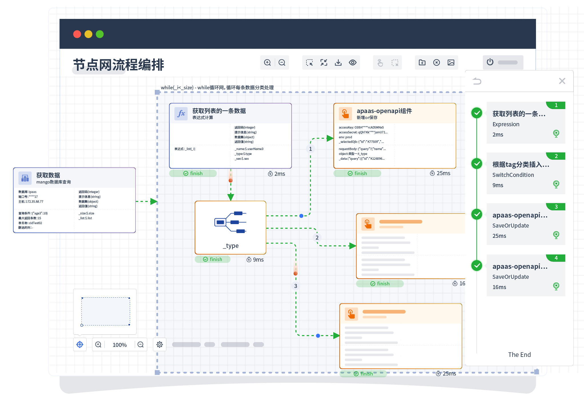 针对集成场景,,,,,,,,,,组件定义后支持进行流程编制,,,,,,,不同于传统代码方式,,,,通过图形化展示,,,,,,,支持在线调试、、、、、日志查看和运行回放。。。。。。。。