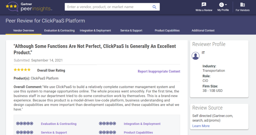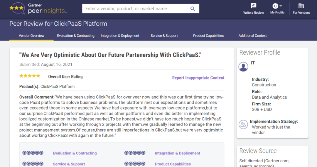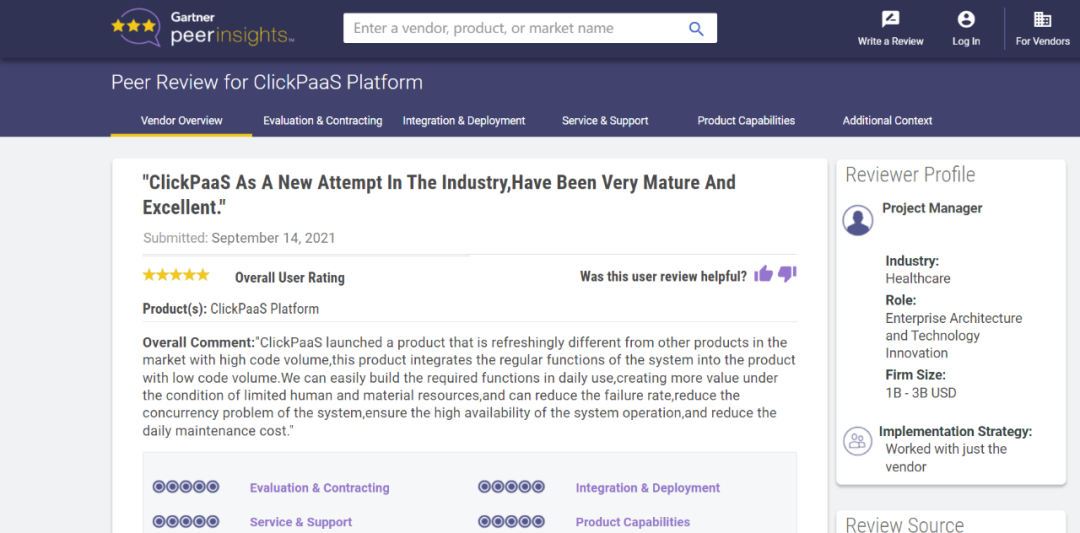 Tips:::::::::::【Peer Insights】——用户对企业IT产品和服务发布真实评价的平台。。。。。。。。目前已有355个市场,,,,,,255,000条经过验证的评价。。。。。。。。。。每一条评价Gartner会针对参评企业营收规模及参评人员信息做验证、、、、、、、、评价内容做多维核实。。。。。。。。。。。。。